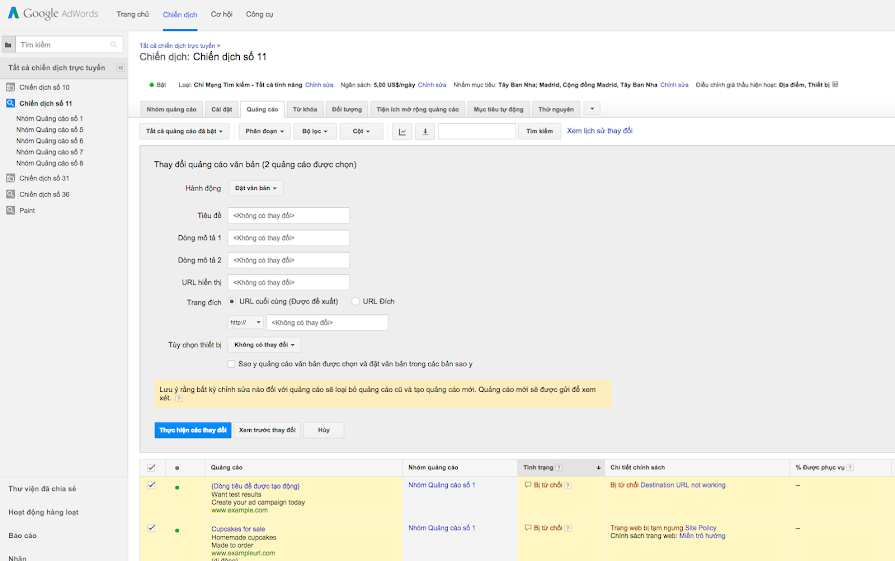 Có một số lý do để chỉnh sửa văn bản, URL hiển thị hoặc URL trang đích của quảng cáo văn bản. Bạn có thể cần sửa lỗi đánh máy hoặc cập nhật URL cuối cùng. Bạn cũng có thể chỉnh sửa quảng cáo sau khi tìm hiểu cách kết nối hiệu quả hơn với đối tượng của mình. Bài viết này giúp bạn biết cách chỉnh sửa từng quảng cáo văn bản mỗi lần hoặc chỉnh sửa hàng loạt.