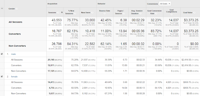 Tuy nhiên, nếu bạn nhìn vào Tỷ lệ chuyển đổi mục tiêu, bạn thấy rằng mặc dù số lượng nữ chuyển đổi ít hơn, nhưng Tỷ lệ chuyển đổi mục tiêu của họ cao hơn một chút so với nam (84,13% so với 83,56%).
