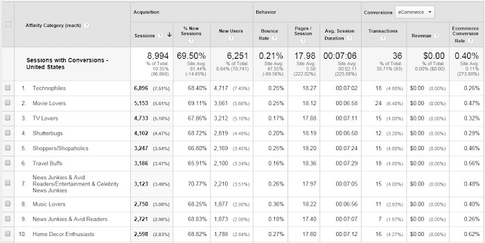 Với cấu hình tối thiểu và chỉ một vài nhấp chuột, bạn có thể tập trung vào các khía cạnh có ý nghĩa của dữ liệu và bắt đầu có được hiểu biết thực sự về ai là người dùng giá trị nhất trong phân đoạn đó. Trong ví dụ này, đó là Nam 25-34, có sở thích về Công nghệ, Phim ảnh và Truyền hình, sử dụng trình duyệt Chrome để bắt đầu phiên từ Hoa Kỳ. Được trang bị loại thông tin này, việc xây dựng đối tượng cho các nỗ lực tiếp thị của bạn nhắm mục tiêu đến người dùng nhiệt tình nhất của bạn thật dễ dàng.