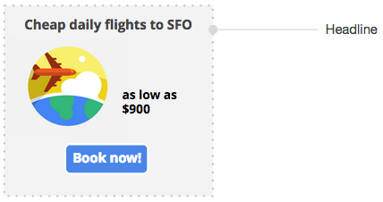 - In the drop-down menu that appears select a feed attribute, which will appear in curly brackets. For example, "{Destination ID}." Insert and arrange your attributes in this field. You can also include static text. For example, to create the headline "Cheap daily flights" shown above, you’d enter "{Flight description} to {Destination name}" in the headline field.