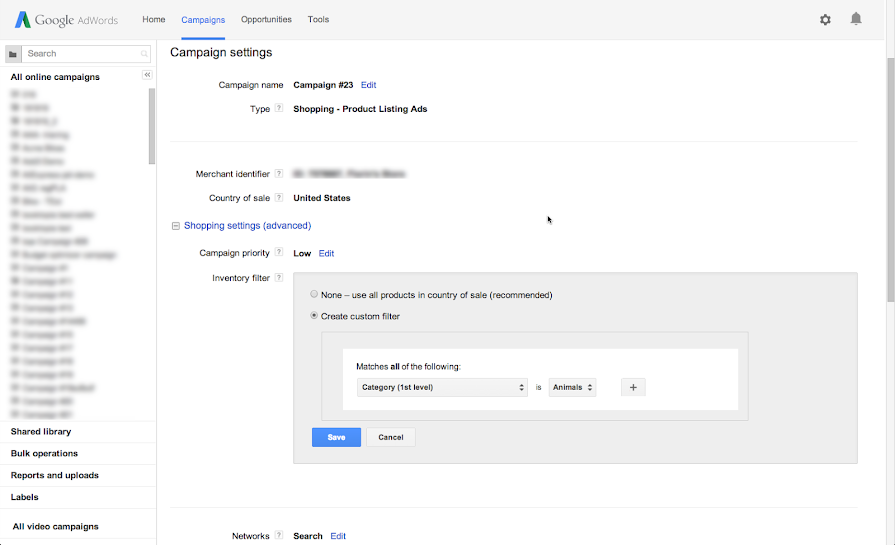 - Use the optional “inventory filter” to limit the products you want to advertise in your Shopping campaign based on the Merchant Center product attributes you choose. By default, the inventory filter is set to “None - Use all products in country of sale (recommended).” To change, select Create custom filter.