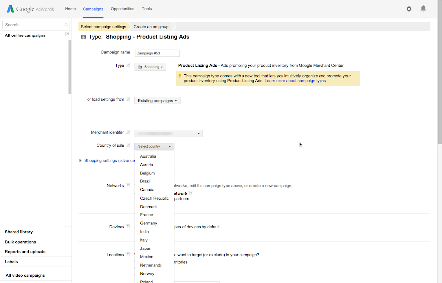 - From the drop-down menu next to “Country of Sale” select the country where the products in this campaign are sold. This setting defines which products from your Merchant Center inventory are advertised in this campaign. It filters products based on the target country associated with the products.