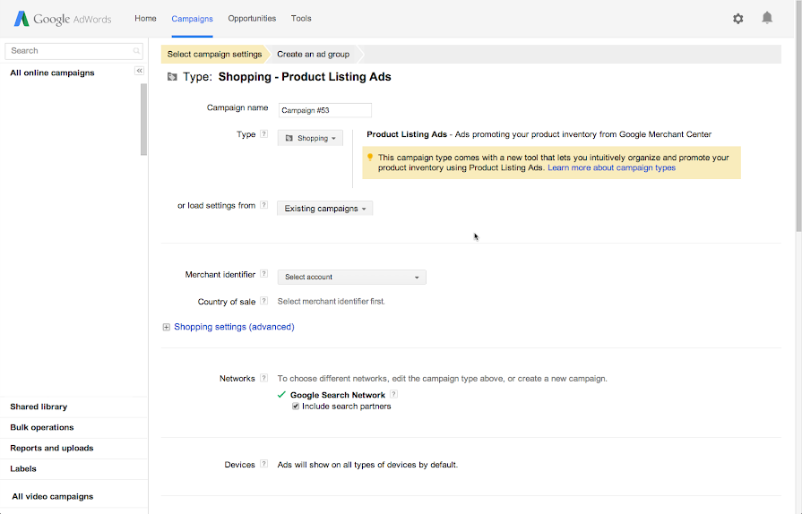 - On the “Select campaign settings” page, give your campaign a name. If you want to use the same campaign settings as another Shopping campaign, go to “or load settings from” and select the campaign from the “Existing campaigns” drop-down menu.