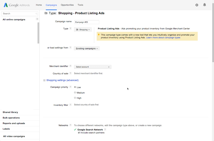 - Use the optional “campaign priority” setting when you have multiple Shopping campaigns advertising the same product and you want to determine which campaign (and its associated bid) will be used when ads for these products show. By default, all Shopping campaigns are set to “Low” campaign priority. To change, select “Medium” or “High,” depending upon how you choose to prioritize this campaign over other Shopping campaigns with the same products. Learn more about the campaign priority setting.
