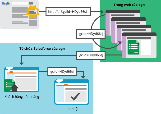 Khi khách hàng gửi biểu mẫu khách hàng tiềm năng trên trang web của bạn, trang web của bạn sẽ chuyển GCLID cho Salesforce và lưu trữ nó trong khách hàng tiềm năng tương ứng và bất kỳ cơ hội nào trong tương lai có nguồn gốc từ khách hàng tiềm năng này.
